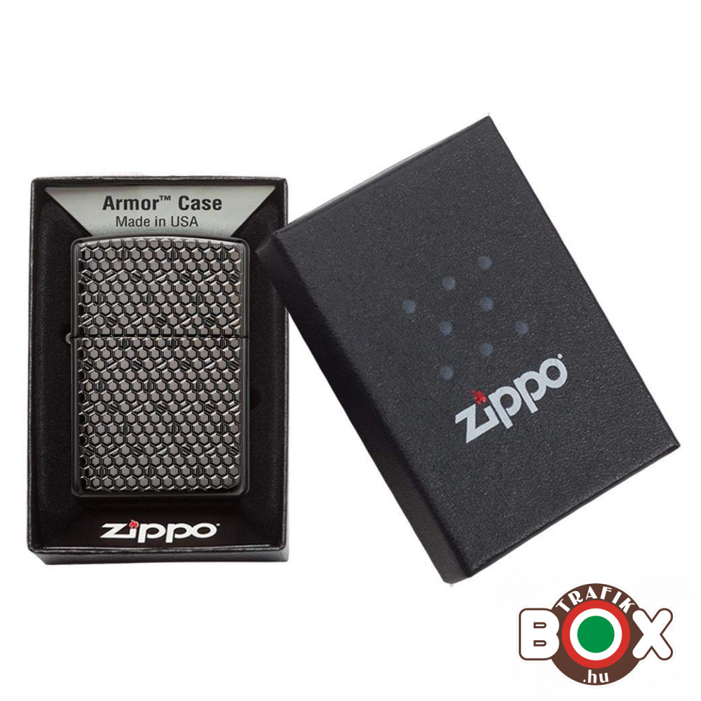 Vesszen el ebben a lenyűgöző Black Ice ® dizájnban. A jellegzetes Deep Carve eljárással a Zippo művészei hatszögletű mintát tudtak létrehozni egy másik hatszögletű mintán belül. Díszdobozba csomagolva érkezik. Az optimális teljesítmény érdekében töltse fel Zippo öngyújtó üzemanyagot .